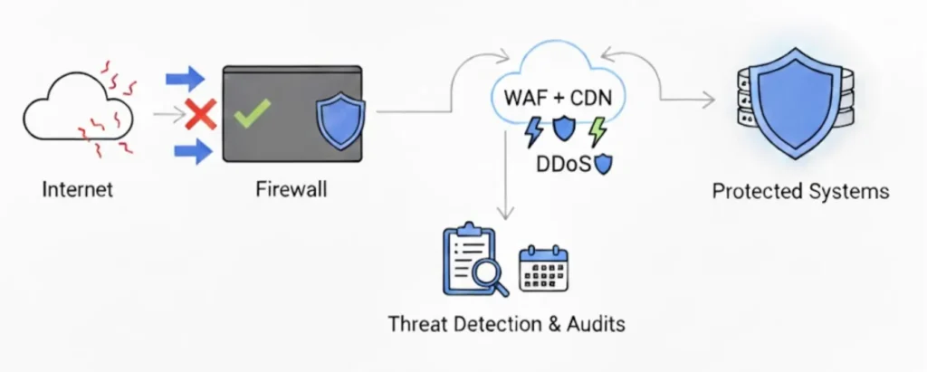 WAF + CDN: Blocks DDoS attacks and common web threats